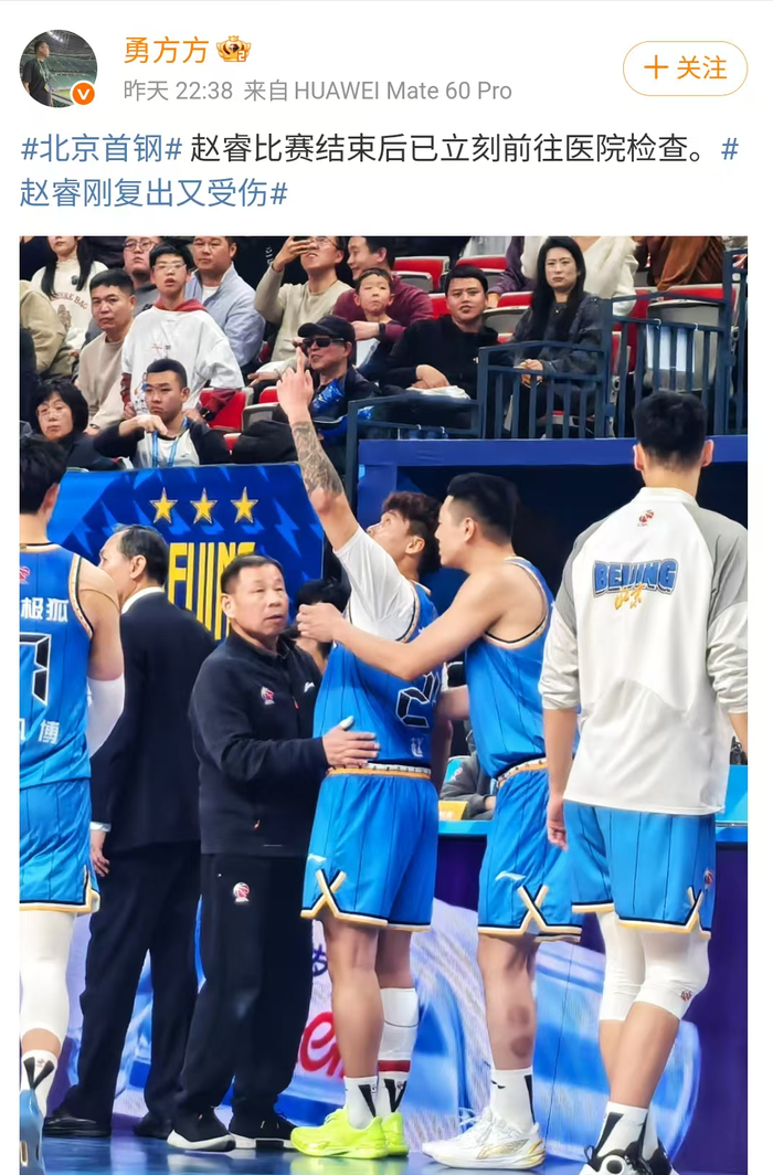 赵睿是回归了,但是在比赛中,赵睿被北控外援推倒后,背部直挺挺的砸在地板上,随后,赵睿退出了比赛,赛后,名记勇方方表示,北京首钢男篮已经连夜将赵睿送到医院进行进一步的检查。