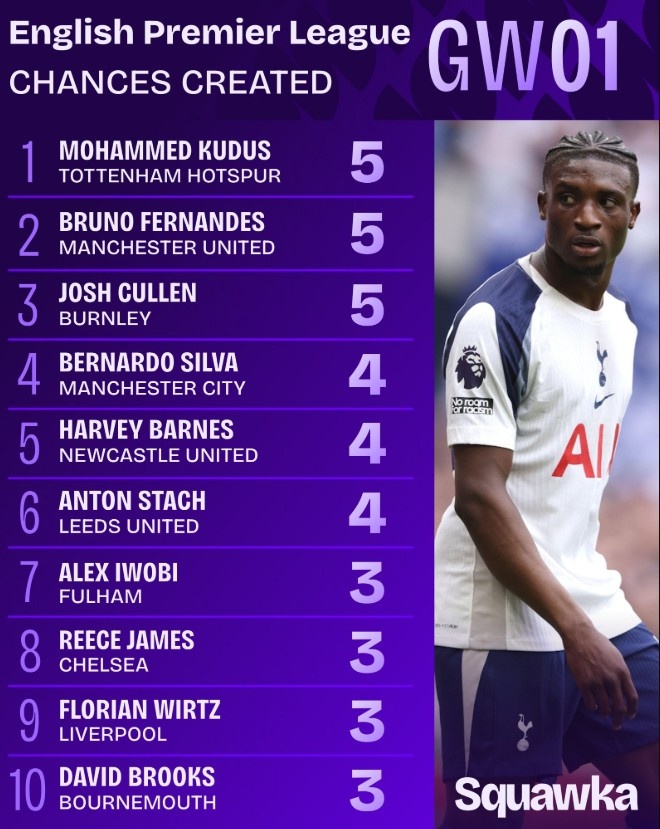 8月20日讯 新赛季英超首轮比赛已经结束了全部争夺,根据Squawka的数据统计,库杜斯、布鲁诺-费尔南德斯以及约什-库伦并列创造机会最多球员。值得一提是,库杜斯首次在英超中单场送出两次助攻。