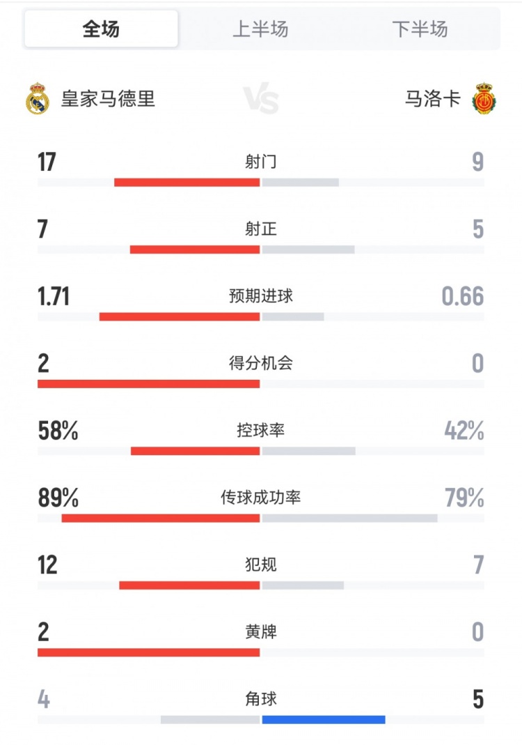 8月31日西甲第三轮,皇家马德里主场以2-1战胜马洛卡。两队全场关键数据统计如下(主队皇马列前)