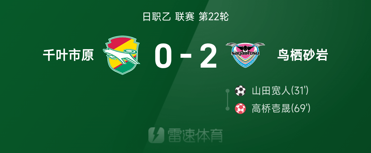 07月05日讯 25赛季日职乙联赛第22轮,鸟栖砂岩2-0战胜千叶市原。全场比赛,山田宽人破门建功,高桥壱晟自摆乌龙。